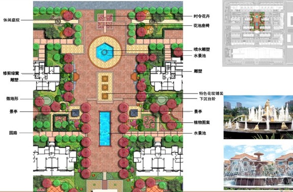 項目考慮“人、自然、空間”之間的和諧關(guān)系,堅持以人為本的設(shè)計理念,在設(shè)計中以生態(tài)環(huán)境優(yōu)先為原則,充分考慮建筑和景觀之間的關(guān)系,通過材料和造型的運用,將歐式建筑和新古典景觀進行風格樣式上的對接。在規(guī)劃的同時,輔以景觀設(shè)計,最大限度的體現(xiàn)居住區(qū)本身的底蘊。設(shè)計中結(jié)合當?shù)靥厣谛^(qū)中設(shè)置小區(qū)中心景觀軸線、橫向景觀帶、生態(tài)種植區(qū)等。在中心景觀軸線當中設(shè)置了歐式的矮墻噴泉、花溪疊瀑、下層廣場、噴泉水景等,使居民樂居其中。規(guī)劃設(shè)計注重園林景觀的可參與性,在小區(qū)內(nèi)設(shè)置開闊的硬質(zhì)景觀,如波紋鋪地、琴韻廣場等。小區(qū)內(nèi)公共空間、私密、半私密空間如:下層廣場和健康步道兩者的公共性和私密性設(shè)計對比強烈,動靜結(jié)合。通過不同的景觀設(shè)計,也為小區(qū)居民提供空間上充足、多樣的休閑、交往、活動場地,營造和諧、友善、溫馨的人際關(guān)系氛圍。