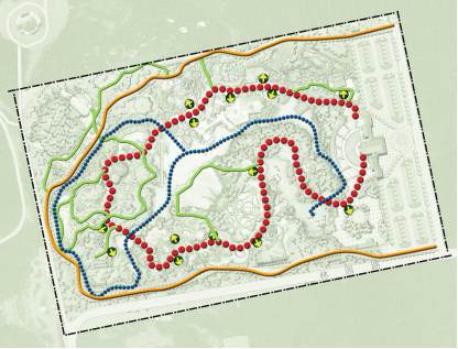 入口服務區:繽紛廣場、游客服務中心、生態停車場、特色景觀墻、飛行塔